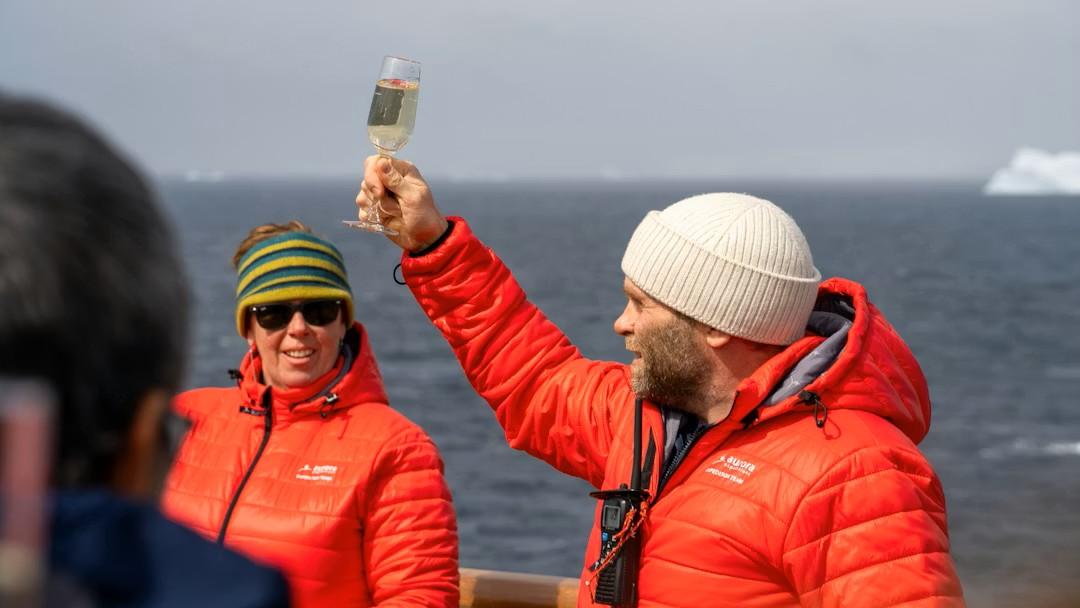 Celebrating the crossing of the Antarctic Circle at approximately latitude 66°33’ South.