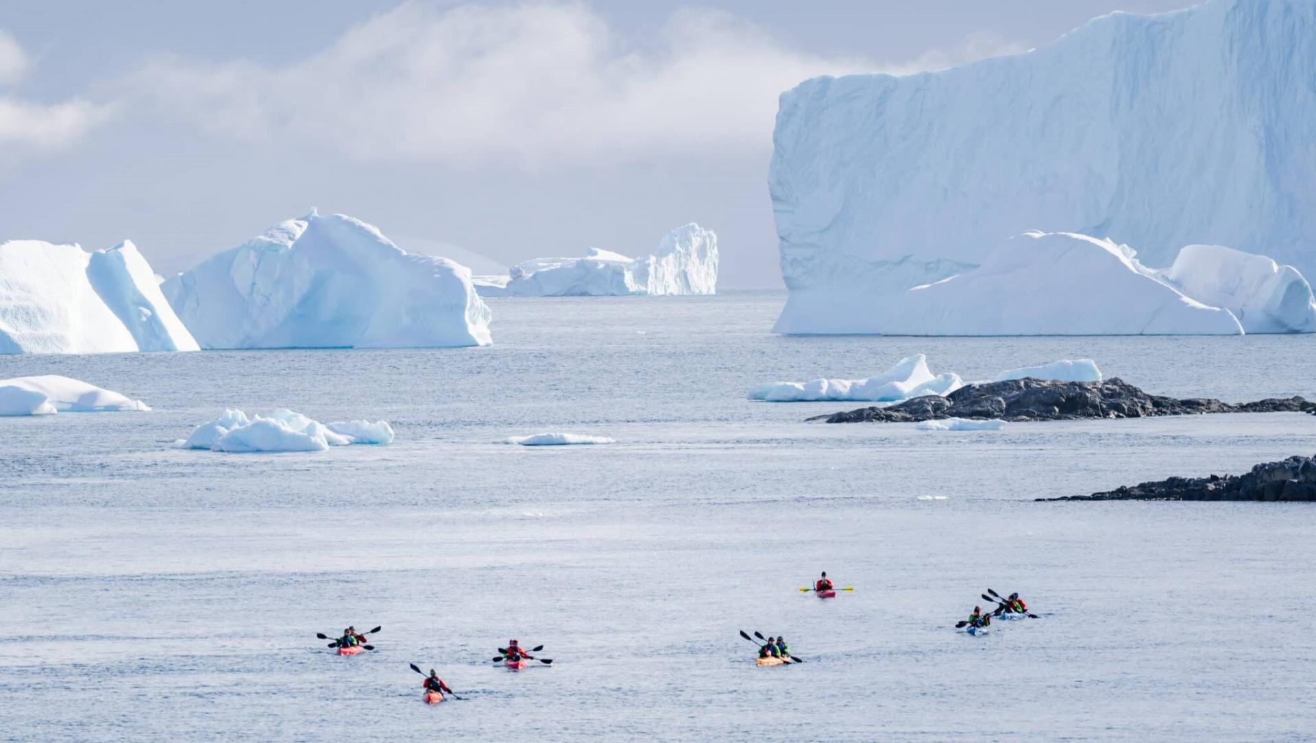Zodiac cruising in secluded bays filled with brash ice and enormous glaciers