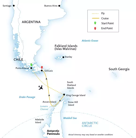Take the fastest route to Antarctica – a three-hour flight – and enjoy your first glimpse of the continent from the air, a unique introduction to the vast and dramatic landscape that remains one of the last unspoiled regions in the world.