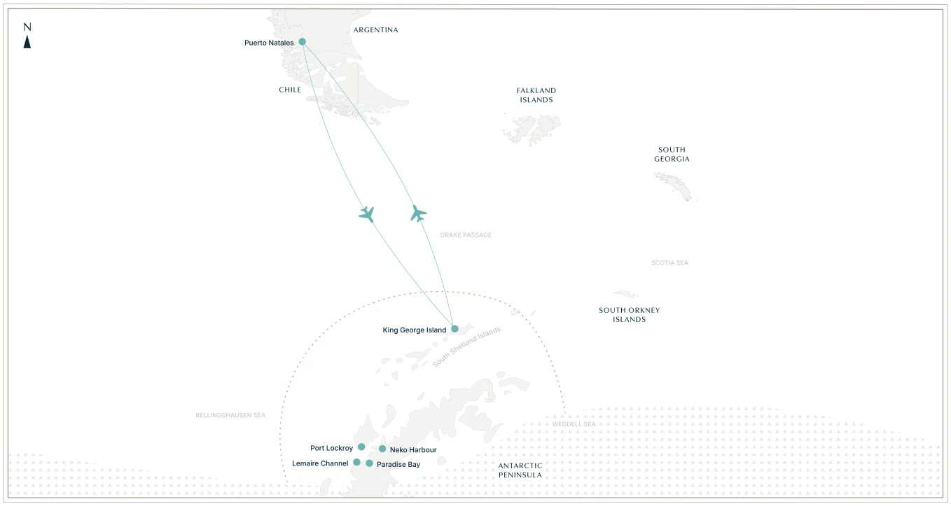 This is an exclusive fly-and-cruise expedition that skips the Drake Passage with round-trip flights from Puerto Natales. The trip is a "Micro Cruise" limited to 42 guests aboard the Polar Athena. The core experience is ringing in the New Year at the edge of the world. The itinerary is flexible and subject to ice and weather conditions.