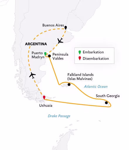 The journey begins in Buenos Aires and features a charter flight to Puerto Madryn. You will spend three days exploring the Falklands archipelago, with visits to sites like New Island and the capital, Stanley. The expedition is rich in history, allowing you to visit the grave of explorer Sir Ernest Shackleton in Grytviken and discover World War II relics. You will potentially encounter six penguin species (including King and Rockhopper) and four species of dolphins.