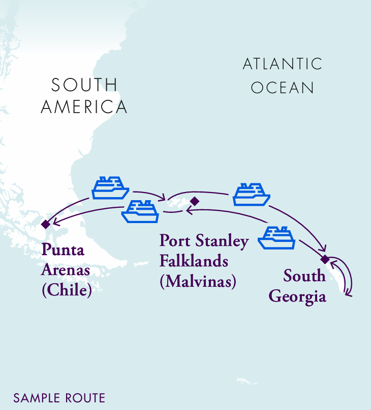 The itinerary is a sample route; landings and Zodiac cruises are subject to weather conditions and government approvals (especially in South Georgia).