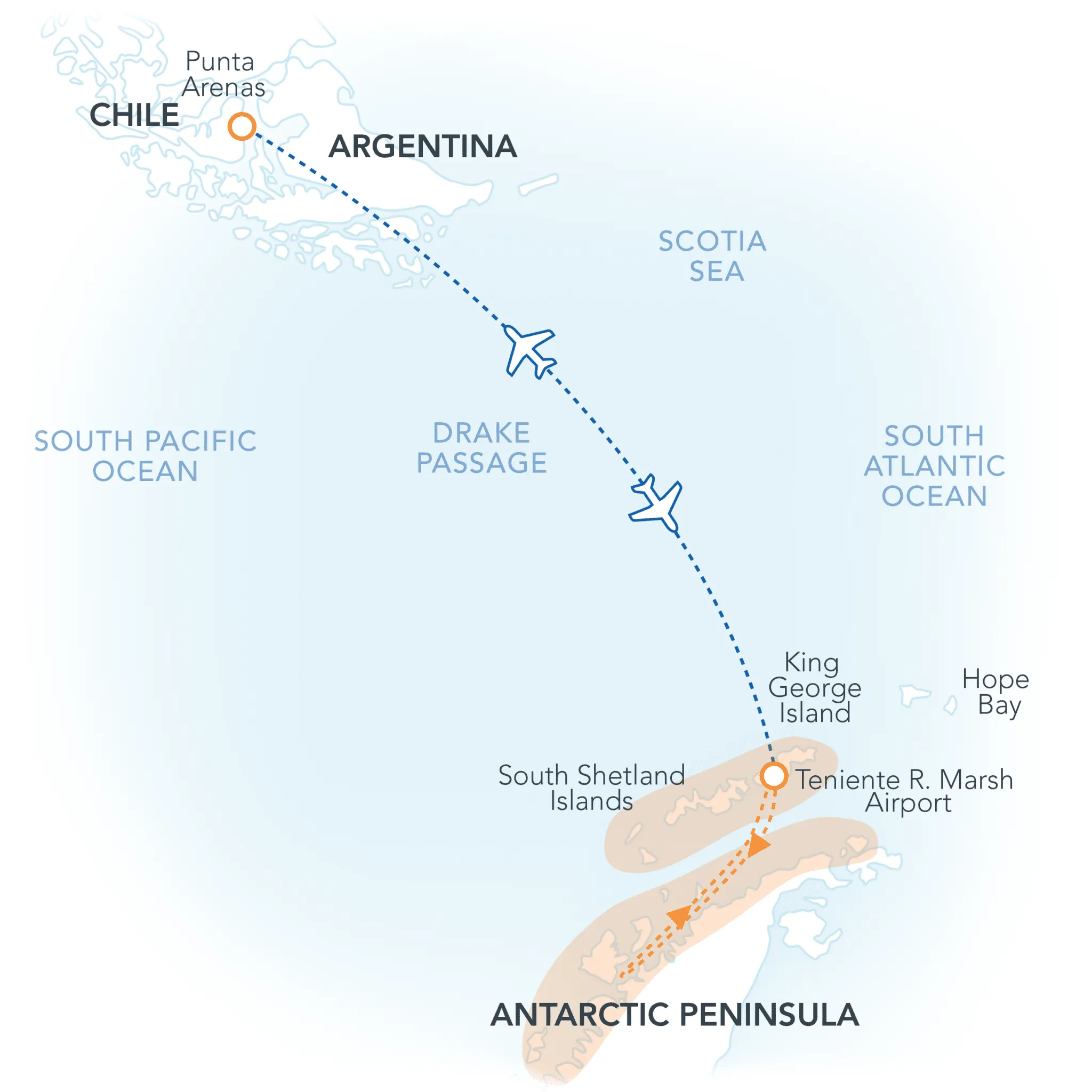 Esta expedición Fly-In, Fly-Out es la opción perfecta para quienes desean disfrutar de la aventura y el descubrimiento antártico con la máxima comodidad. Al sobrevolar las aguas del Pasaje de Drake en ambas direcciones, los pasajeros alcanzan el Continente Blanco en solo dos horas, donde su buque de expedición les espera bajo los picos de la Isla Rey Jorge. Desde el momento del aterrizaje, se verá inmerso en un mundo de glaciares monumentales y icebergs esculpidos, explorando los rincones más vírgenes del planeta guiado por un equipo de líderes de expedición altamente calificados.