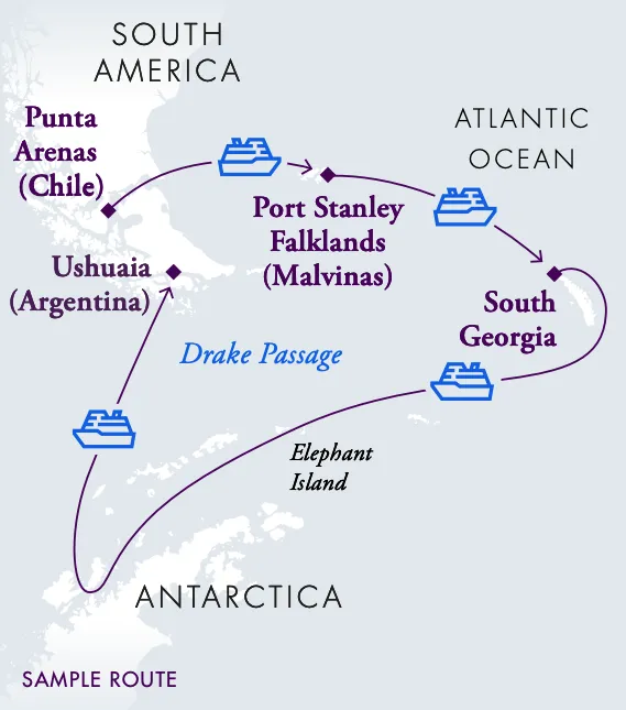 Georgia del Sur es el corazón de la fauna del Atlántico Sur; en lugares como Salisbury Plain y St. Andrews Bay, los viajeros presenciarán concentraciones de cientos de miles de pingüinos rey y enormes elefantes marinos. El viaje rinde homenaje a la era heroica de la exploración polar en Grytviken, visitando la tumba de Sir Ernest Shackleton. Finalmente, la proa se dirige a la Antártida, navegando entre los icebergs colosales del Estrecho Antarctic y las aguas protegidas del Estrecho de Gerlache, culminando en una experiencia transformadora entre glaciares, ballenas y picos nevados antes de desembarcar en Ushuaia.