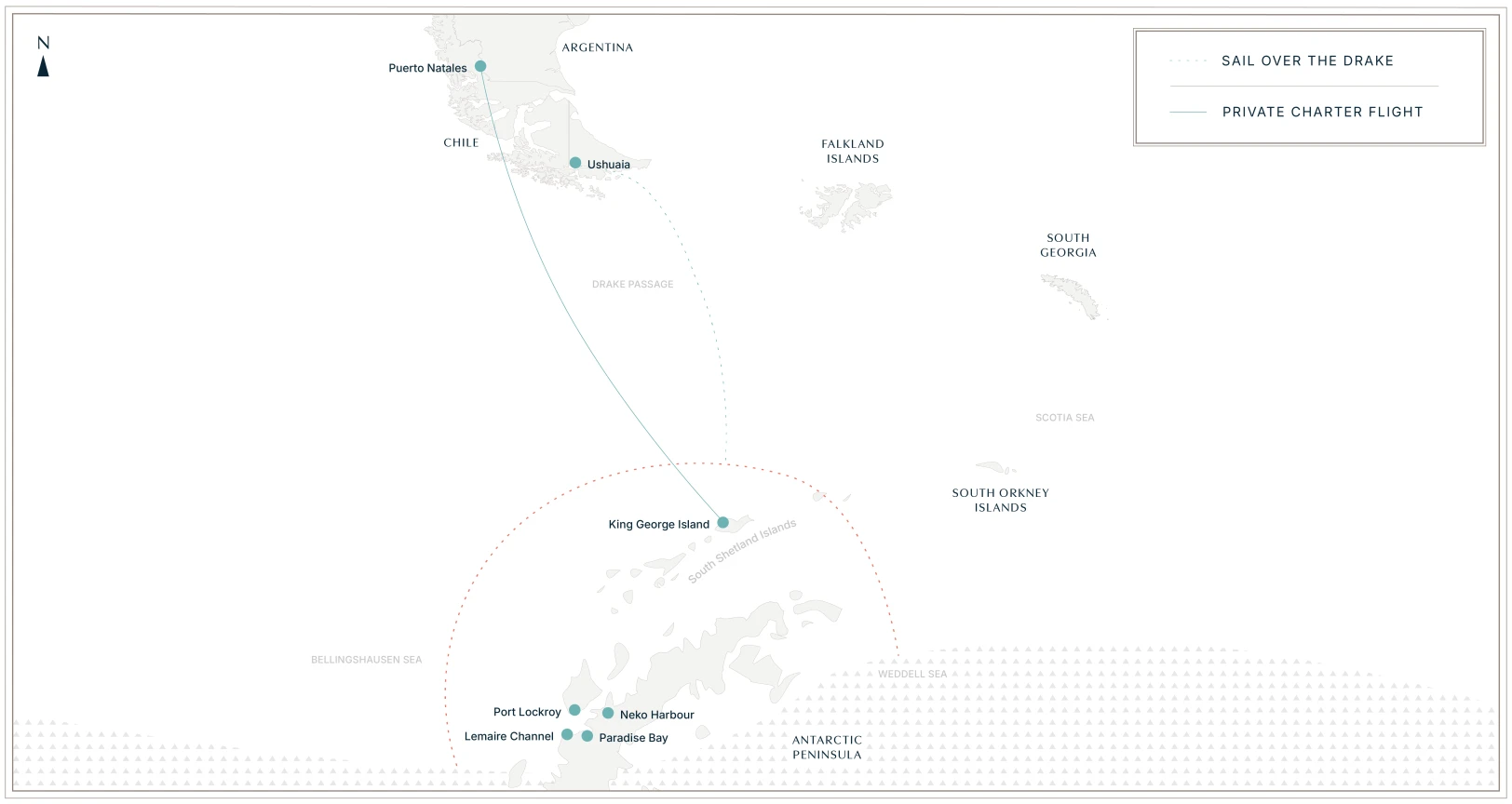 Este es un "Micro Crucero" limitado a 42 huéspedes. Es una expedición de fly-and-sail que cruza el Pasaje de Drake una vez en barco y una vez en vuelo chárter. El vuelo chárter es a bordo de un British Aerospace 146. El itinerario es abierto y altamente flexible debido a las condiciones climáticas y del hielo.