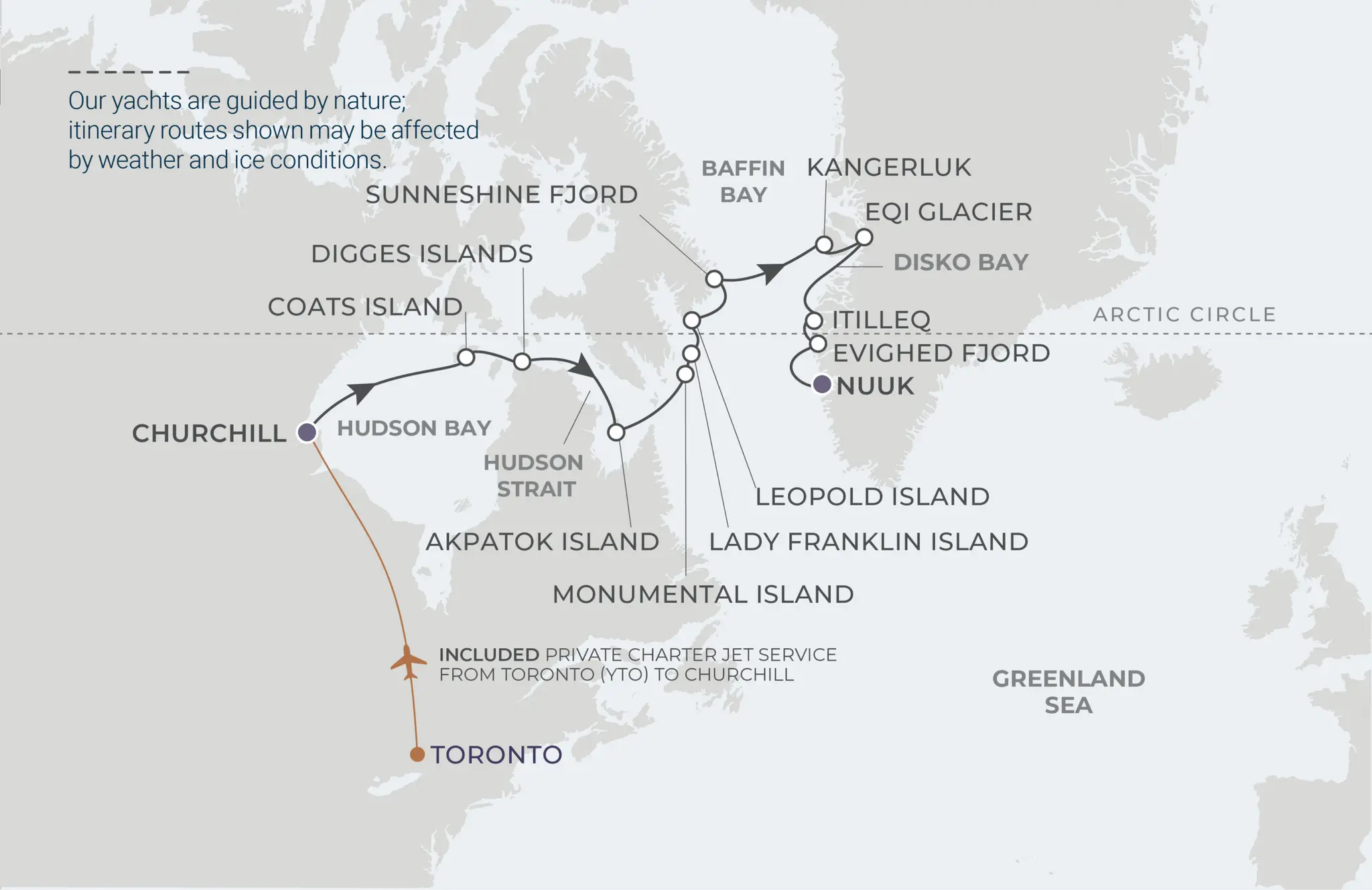 An epic 15-day tri-nation journey from Churchill, Canada, to Nuuk, Greenland. Explore Hudson Bay’s wildlife shores, the Canadian High Arctic's remote islands (Akpatok, Digges), and Greenland's Disko Bay glaciers.