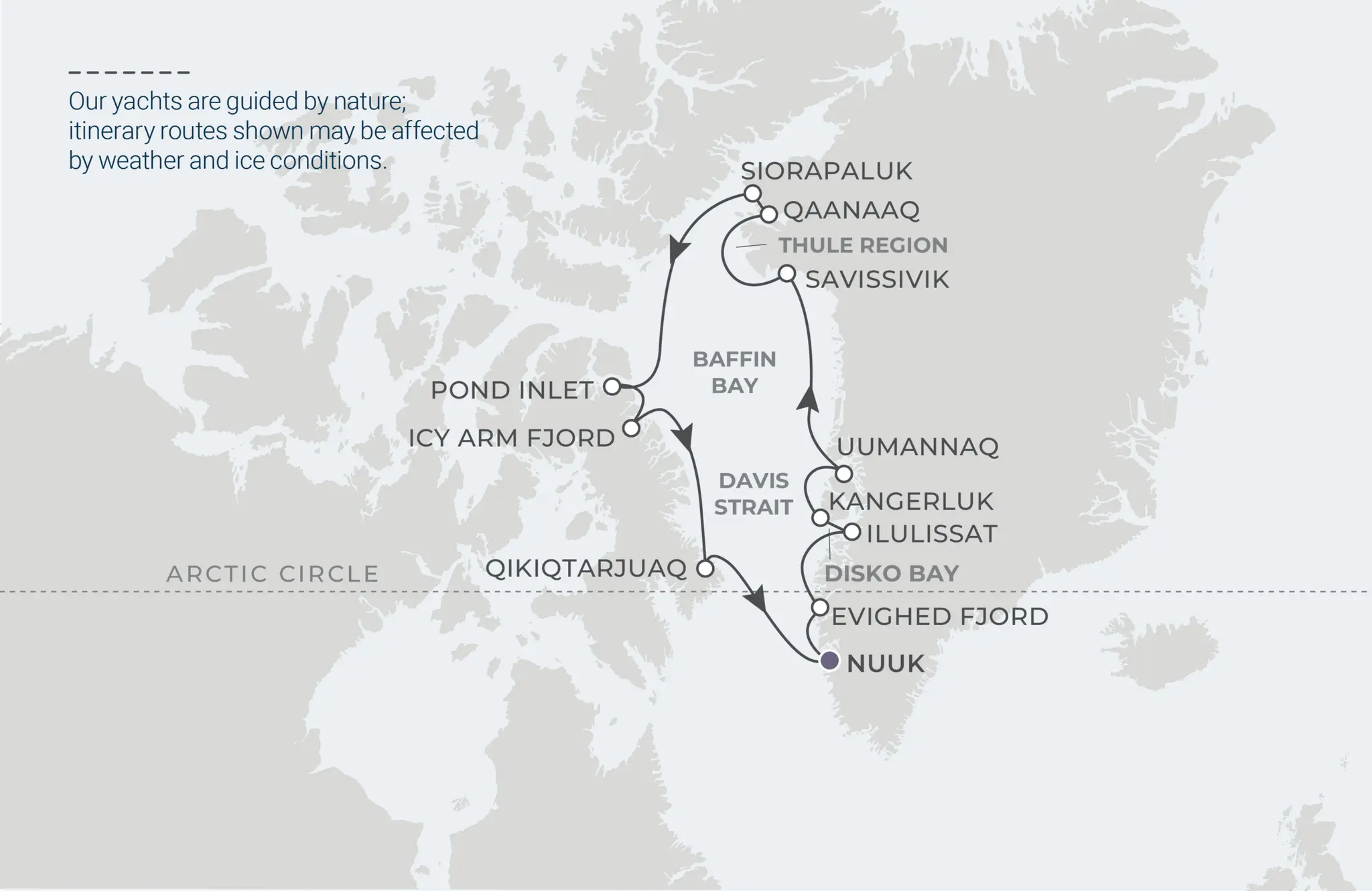 An extensive 16-day expedition from Nuuk to the legendary Thule and back, combining glaciers, wildlife, and cultural heritage across seldom-visited coasts of Greenland and the Canadian Arctic.