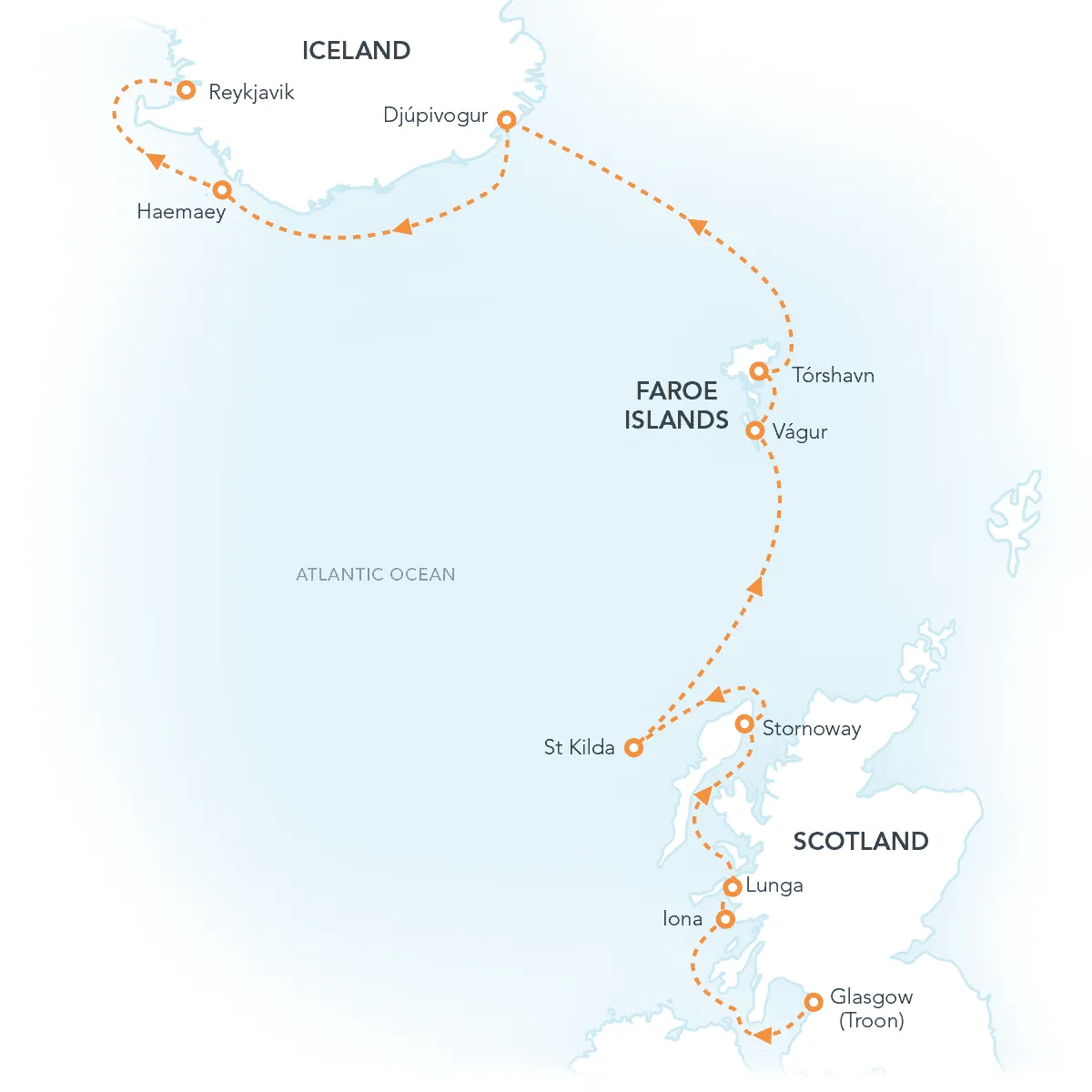 A unique journey island-hopping across the North Atlantic. From the Outer Hebrides and remote St. Kilda to the rugged Faroe Islands and Iceland, explore ancient cultures and volcanic landscapes on a legendary voyage.