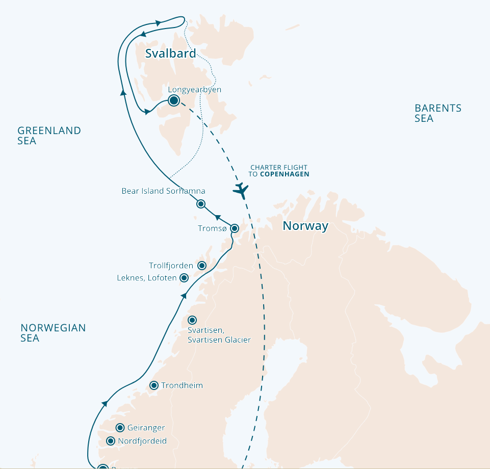 Charter flights to the port of embarkation/ disembarkation (Longyearbyen, Ushuaia, Kangerlussuaq, Nuuk, Honiara, Jayapura and Sorong)