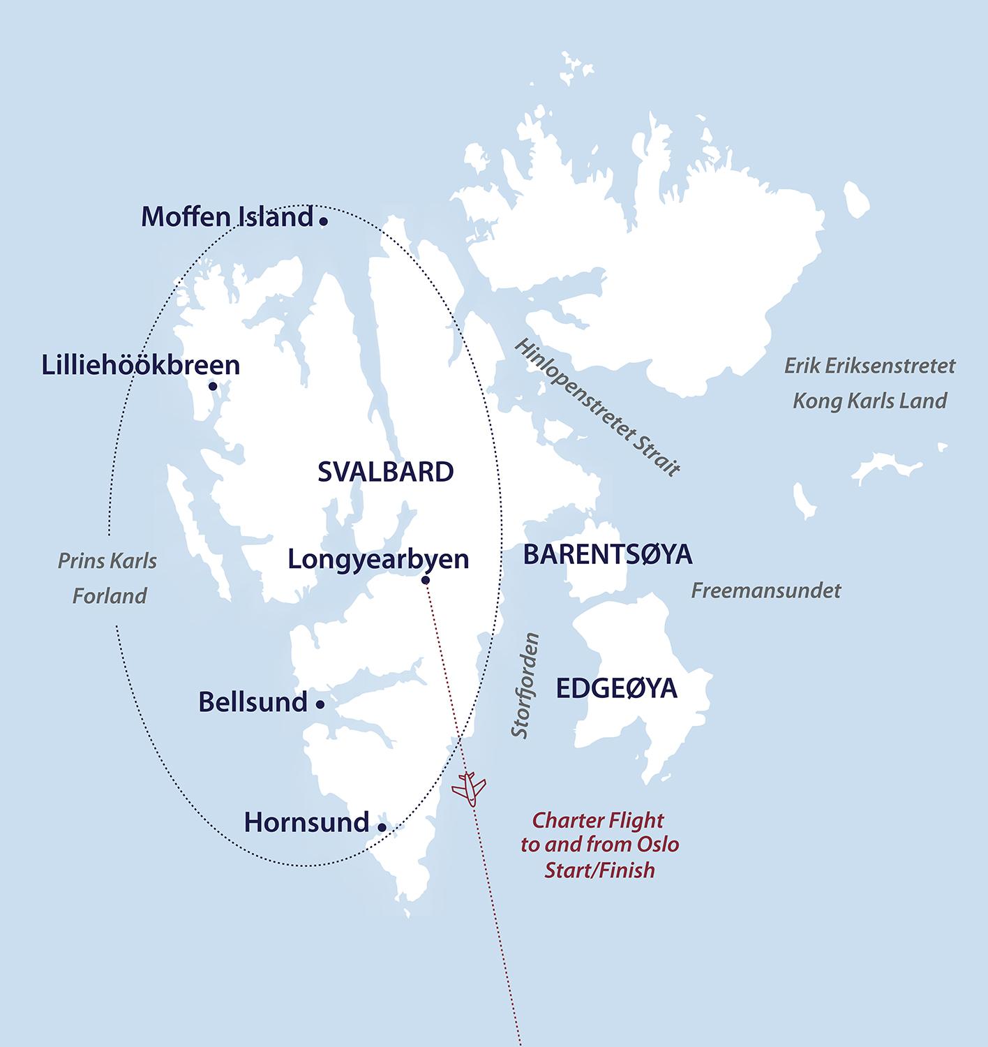 This itinerary includes one night of accommodation in Oslo upon arrival and a charter flight between Oslo and Longyearbyen (Spitsbergen).