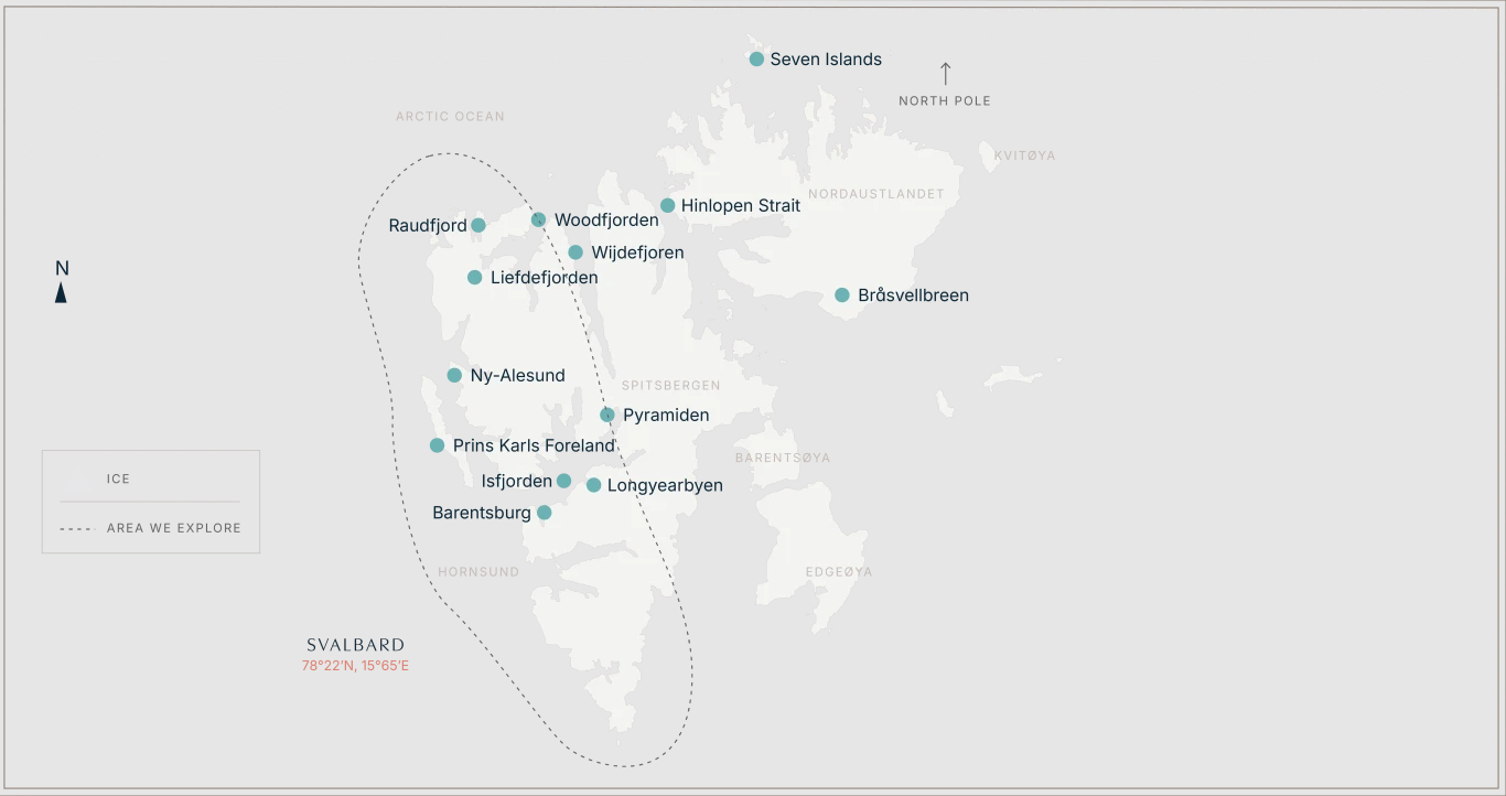 Rather than rushing from landing to landing, this expedition embraces a measured pace. We stay with locations as conditions shift: clouds forming, sea haze drifting through fjords, and light lifting across mountain faces. Expect snow-capped peaks rising directly from the sea and wildlife emerging after the polar winter, including polar bears, walruses, Arctic foxes, and Svalbard reindeer. It is an experience for those who value observation over urgency and seek images grounded in place.