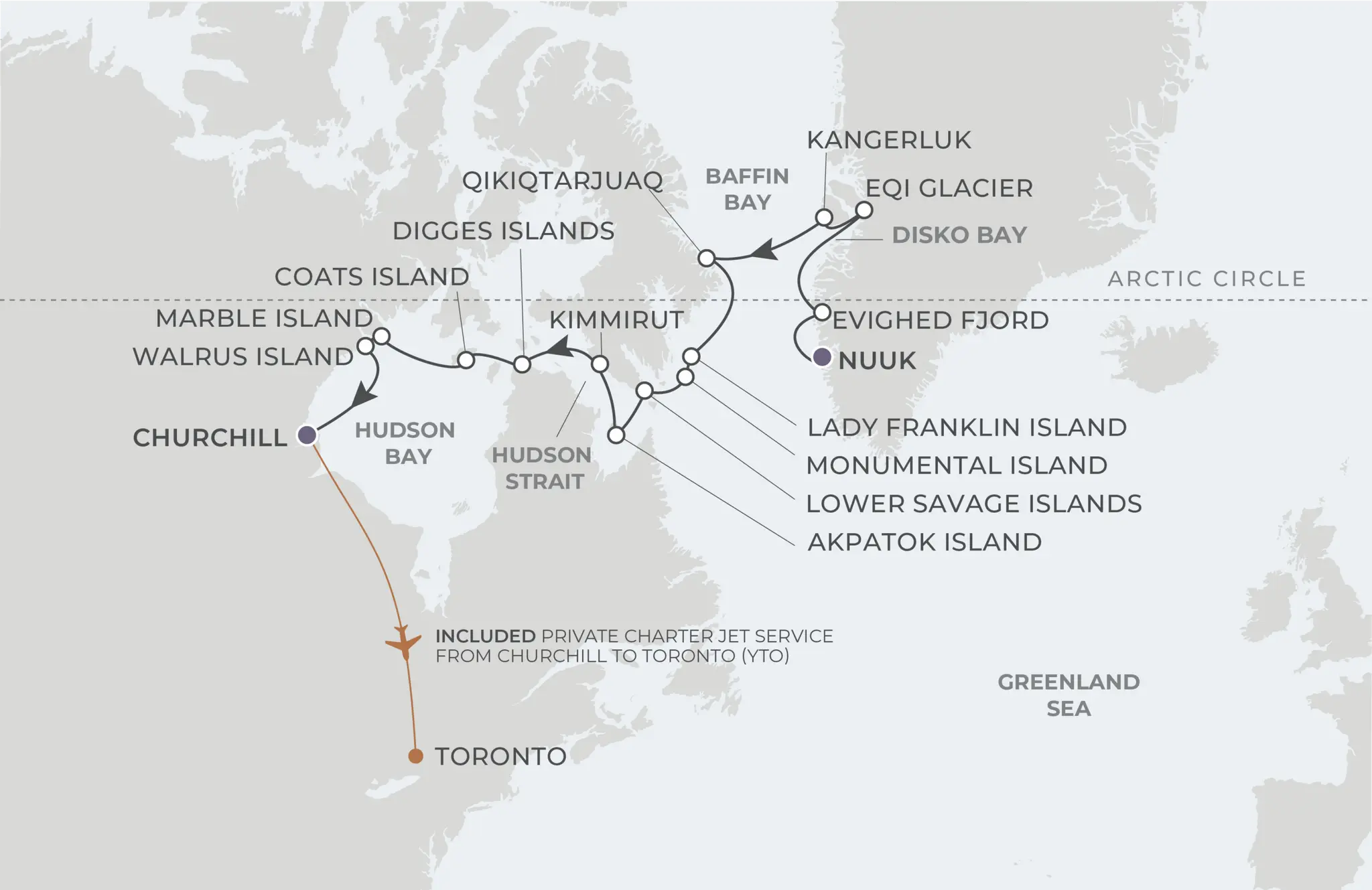 El viaje navega a través de la Bahía de Disko hasta el frente de desprendimiento del Glaciar Eqip Sermia y cruza a las fronteras salvajes de Canadá, hogar de abundantes aves marinas, morsas y osos polares. Explorará acantilados de piedra caliza, puestos históricos de avanzada y naturaleza prístina a lo largo de las inolvidables costas de la Bahía de Baffin y el Estrecho de Hudson. La expedición concluye con una estadía de una noche en Churchill, una comunidad única celebrada por su estuario lleno de belugas y su rica herencia inuit, seguida de un servicio de jet chárter privado a Toronto.