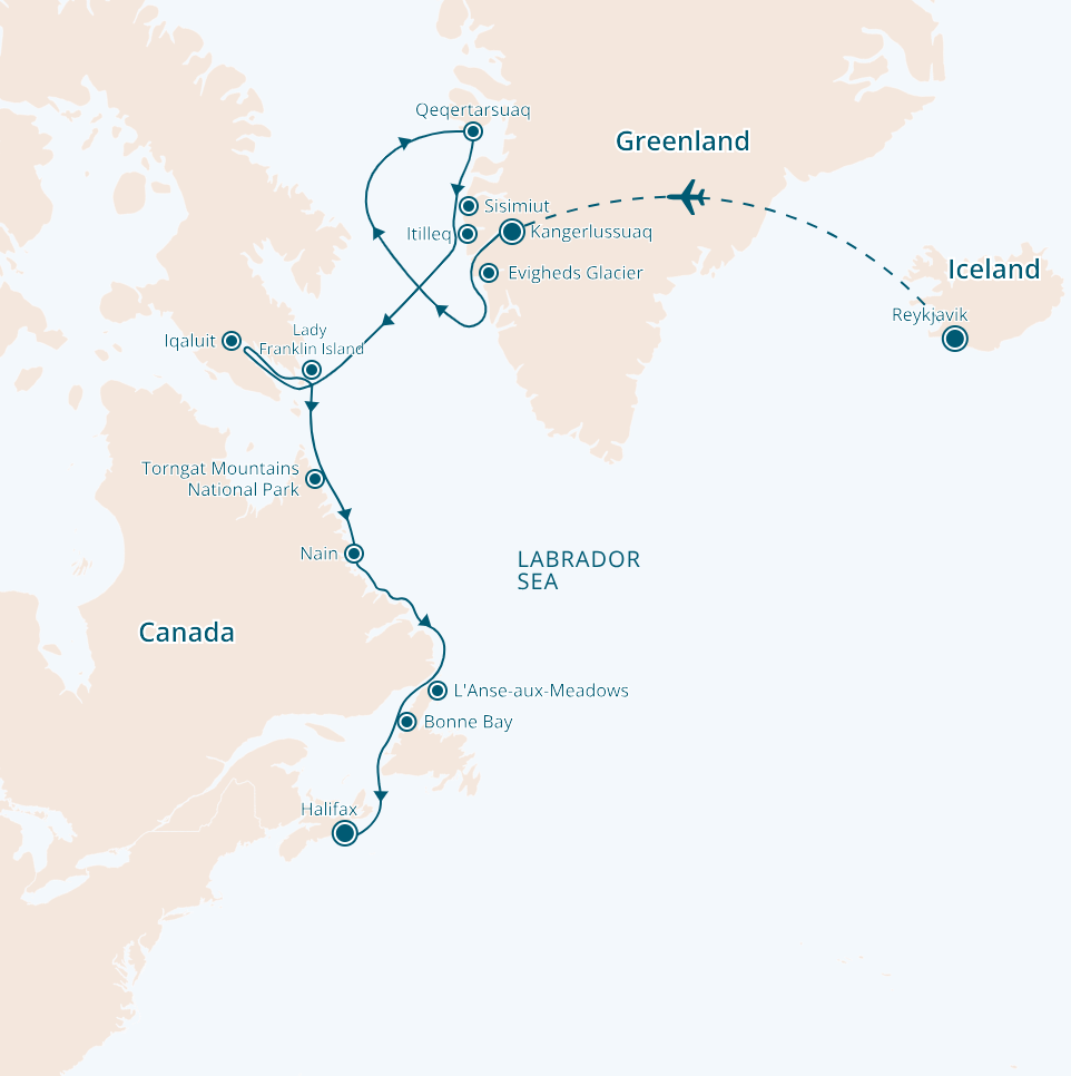 Embárcate en un crucero de lujo desde Groenlandia hasta Canadá, siguiendo una ruta legendaria rica en historia y maravillas naturales. Este viaje comienza en Nuuk, la bulliciosa capital de Groenlandia, y concluye dos semanas después en Halifax, Nueva Escocia. En el camino, contempla los imponentes icebergs y explora comunidades remotas, lo que te ofrecerá una visión única del mundo ártico. A lo largo de esta aventura ártica, visitarás lugares asombrosos como los icebergs que se desprenden del glaciar Evigheds y el fiordo Eternity. Descubre el antiguo sitio nórdico en L'Anse aux Meadows, un sitio de la UNESCO en Terranova, y maravíllate con los fiordos del Parque Nacional Gros Morne. Además, una parada en Iqaluit ofrece una visión de las tradiciones inuit, mientras que los imponentes acantilados de la isla Lady Franklin revelan algunas de las rocas más antiguas de la Tierra. A bordo del crucero de lujo, disfruta de una variedad de actividades. Disfruta de conferencias dirigidas por expertos y talleres de fotografía, navega en kayak con un equipo de expedición o explora las aguas del Ártico durante el día y descansa cómodamente a bordo. Perfeccione sus habilidades fotográficas o sumérjase en la biblioteca bien surtida del barco para profundizar su conocimiento de la región. Este viaje promete una combinación poco común de aventura y descubrimiento en medio del prístino paisaje del Ártico.