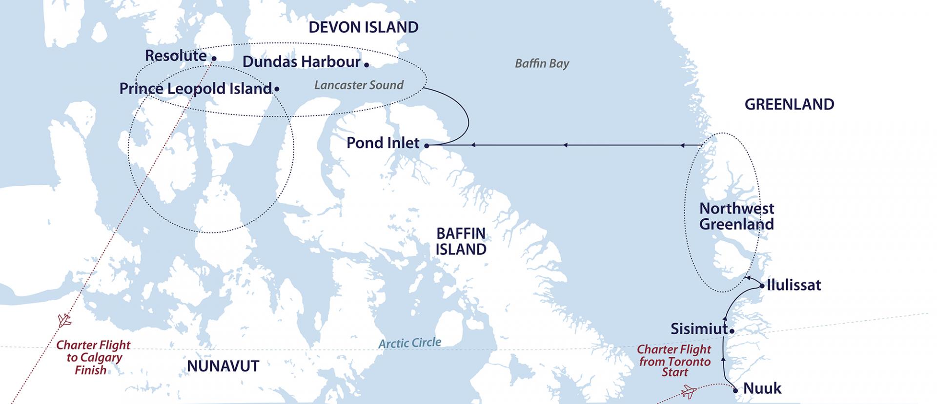 Incluye una noche de hotel en Toronto a la llegada y una noche de hotel en Calgary antes de la salida. Incluye vuelos chárter desde Toronto a Nuuk (Groenlandia) y desde Resolute (Canadá) a Calgary.