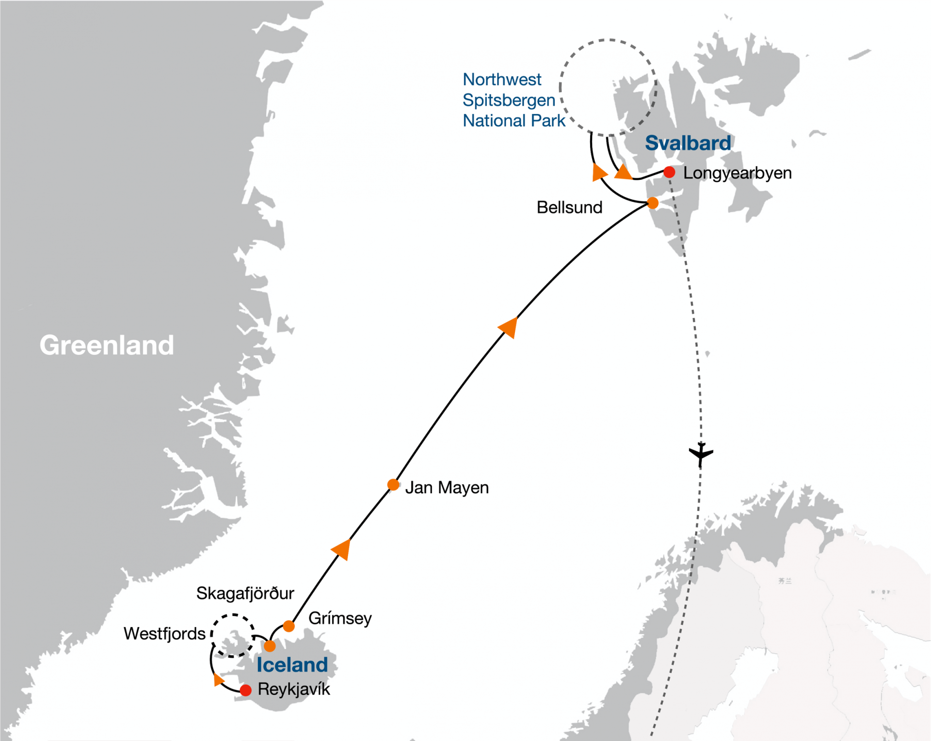 Incluye una noche de hotel previa al crucero en Reikiavik y un vuelo chárter de Longyearbyen a Oslo al finalizar el viaje.
