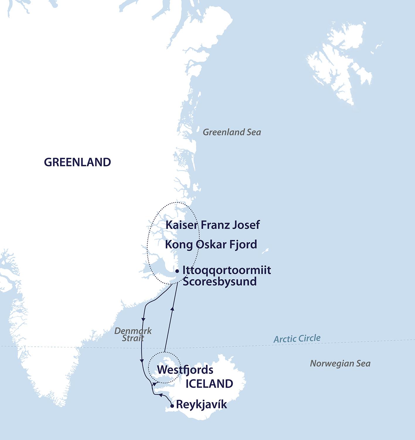 Este viaje Islandia y Groenlandia Oriental - Bajo las Luces del Norte es una exploración sin igual, que se dirige a los vastos y remotos paisajes del Este de Groenlandia y los dramáticos Fiordos Occidentales de Islandia. La única garantía es un auténtico viaje de exploración y aventura, que comienza con un recorrido terrestre esencial por el Círculo Dorado de Islandia. Navegamos hacia los colosales sistemas de fiordos de Groenlandia, incluido el espectacular Fiordo Kaiser Franz Joseph, donde los glaciares descargan icebergs del tamaño de pequeñas ciudades, y el inmenso Scoresby Sund, el sistema de fiordos más grande del mundo.