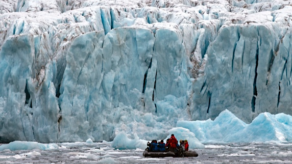 Zodiac exploration in front of colossal glaciers in Krossfjorden.