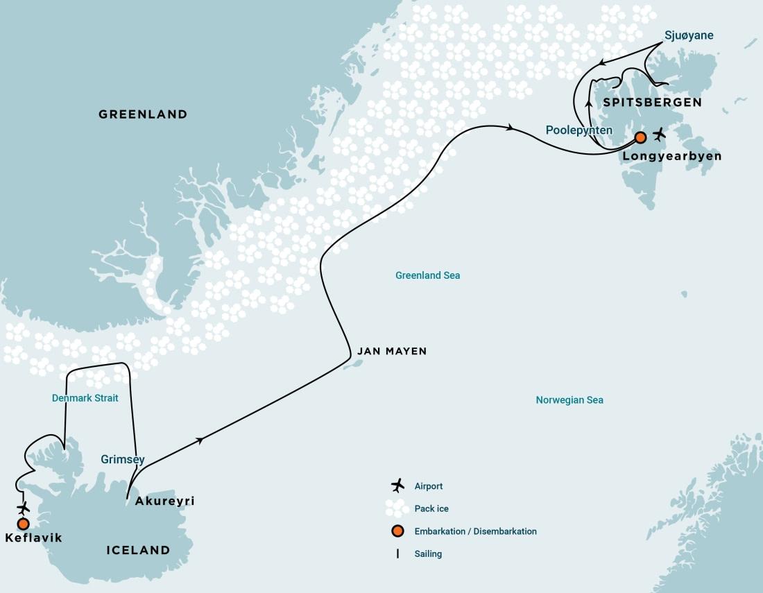 Descubra la belleza del Océano Ártico en una travesía épica desde Islandia hasta Spitsbergen. Cruce el Círculo Polar, explore la remota Jan Mayen y navegue por la banquisa del Estrecho de Dinamarca en busca de osos polares, ballenas y miles de aves marinas.