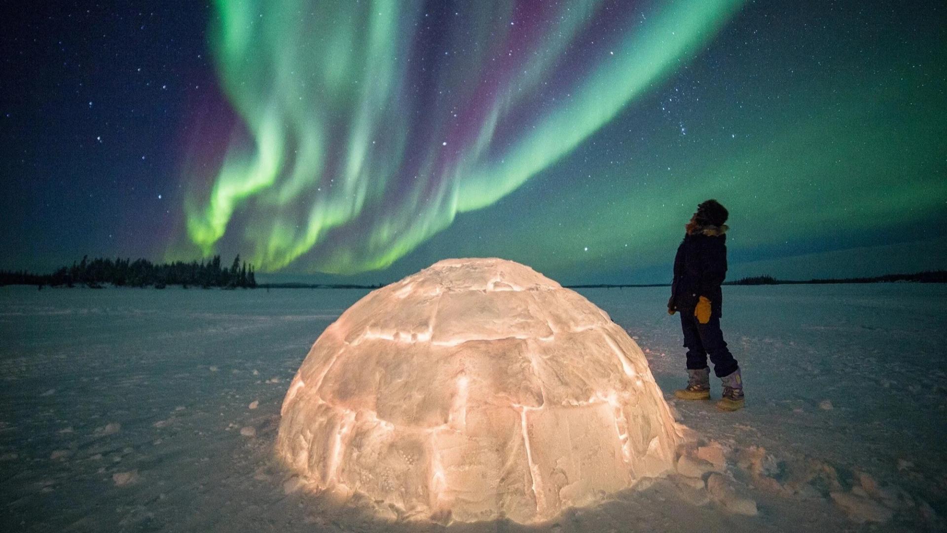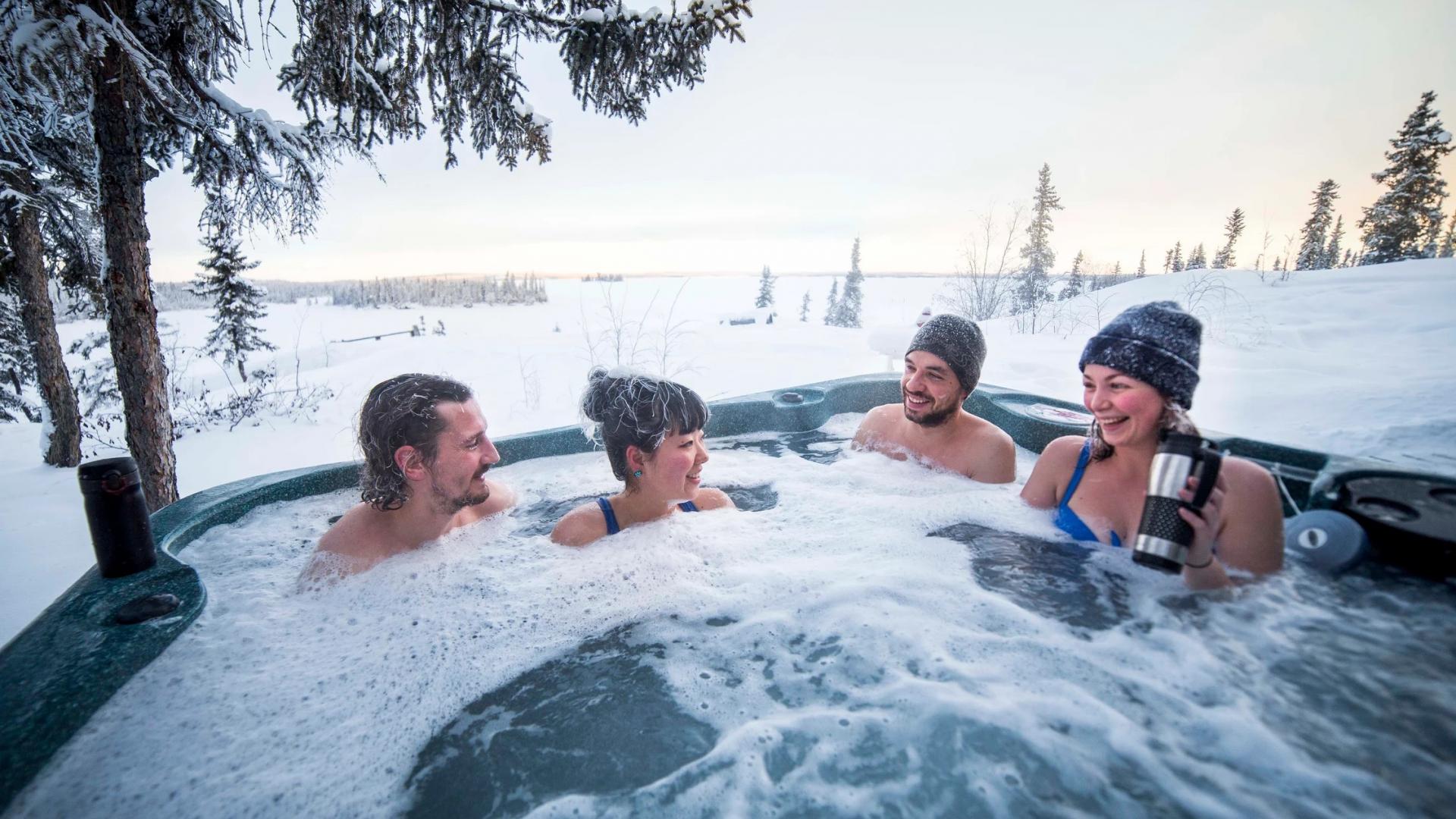 Actividades en la naturaleza remota: motos de nieve, construcción de iglús y avistamiento de auroras desde el jacuzzi.