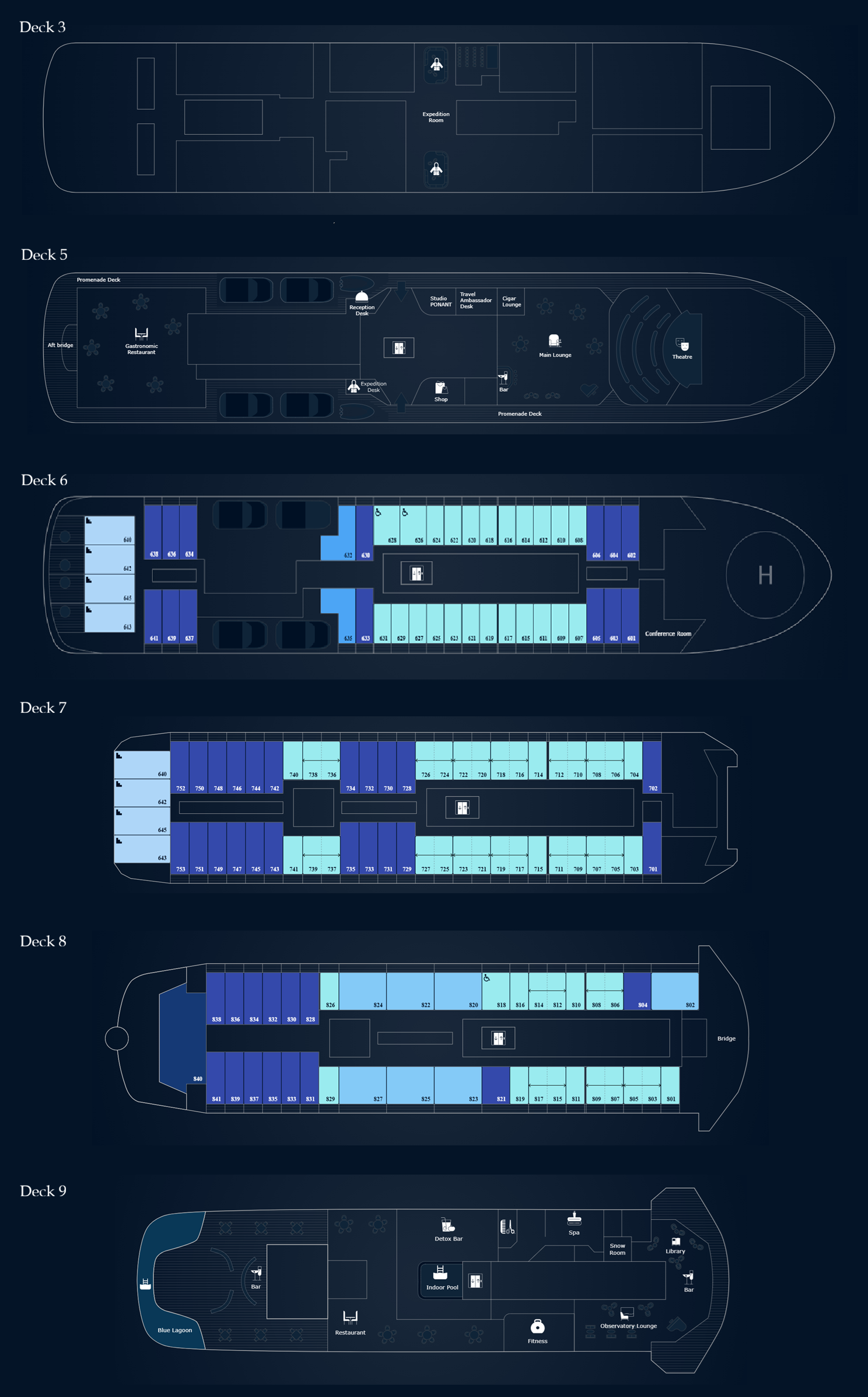 The indoor swimming pool, the conservatory, the panoramic restaurant, the Blue Lagoon outdoor restaurant, the Main Lounge, the Observation Lounge, the lobby… Each of the common areas has been designed to both convey French-style discreet luxury and arouse wonder and amazement. The common thread running through all their designs is the desire to allow the light to penetrate and open everything up the extraordinary polar landscapes and scenery.