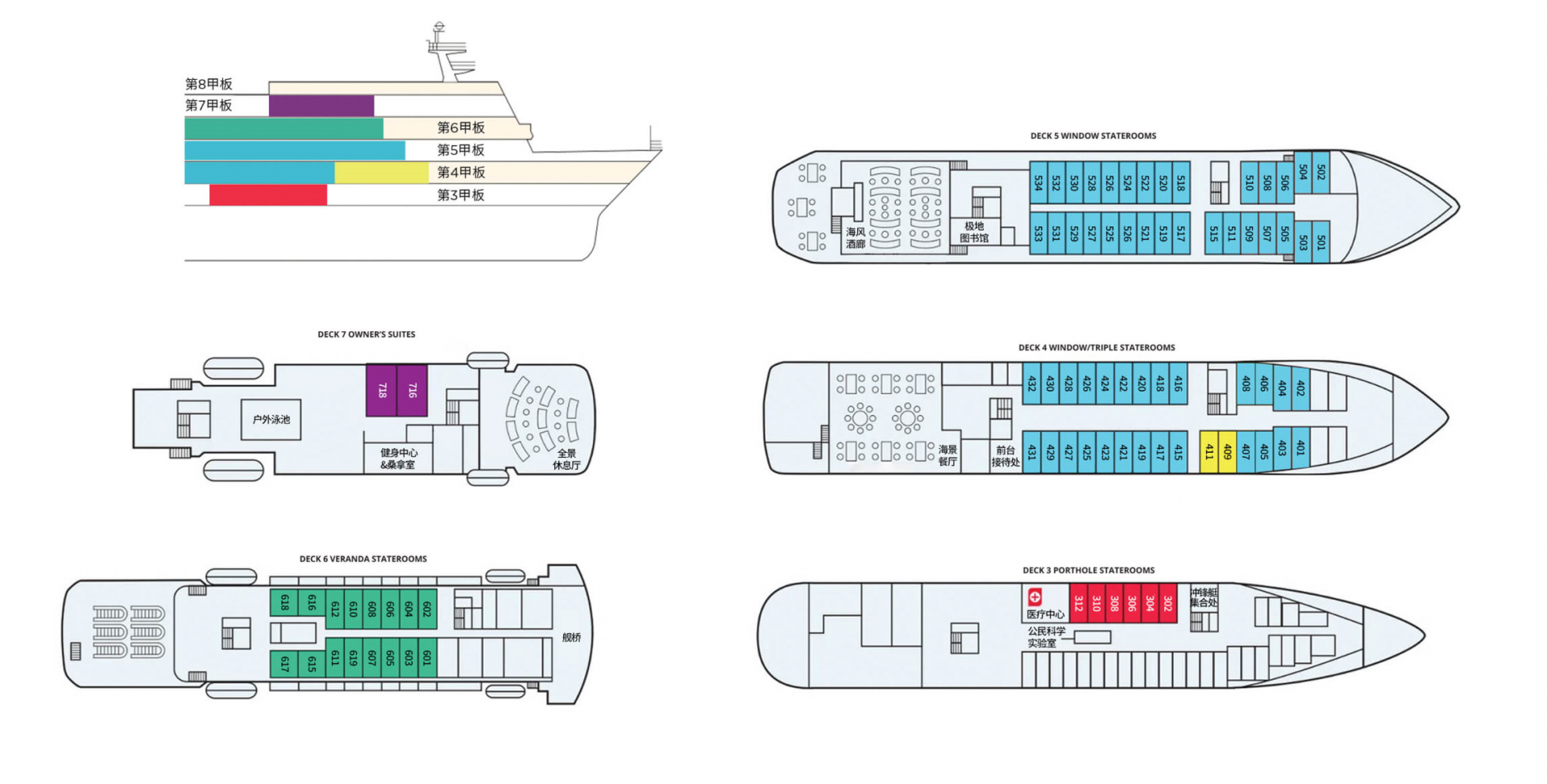 It is equipped with 15 inflatable boats (Zodiacs) and dedicated access points on Deck 3, along with a Science Lab, emphasizing immersive experiences and education onboard.