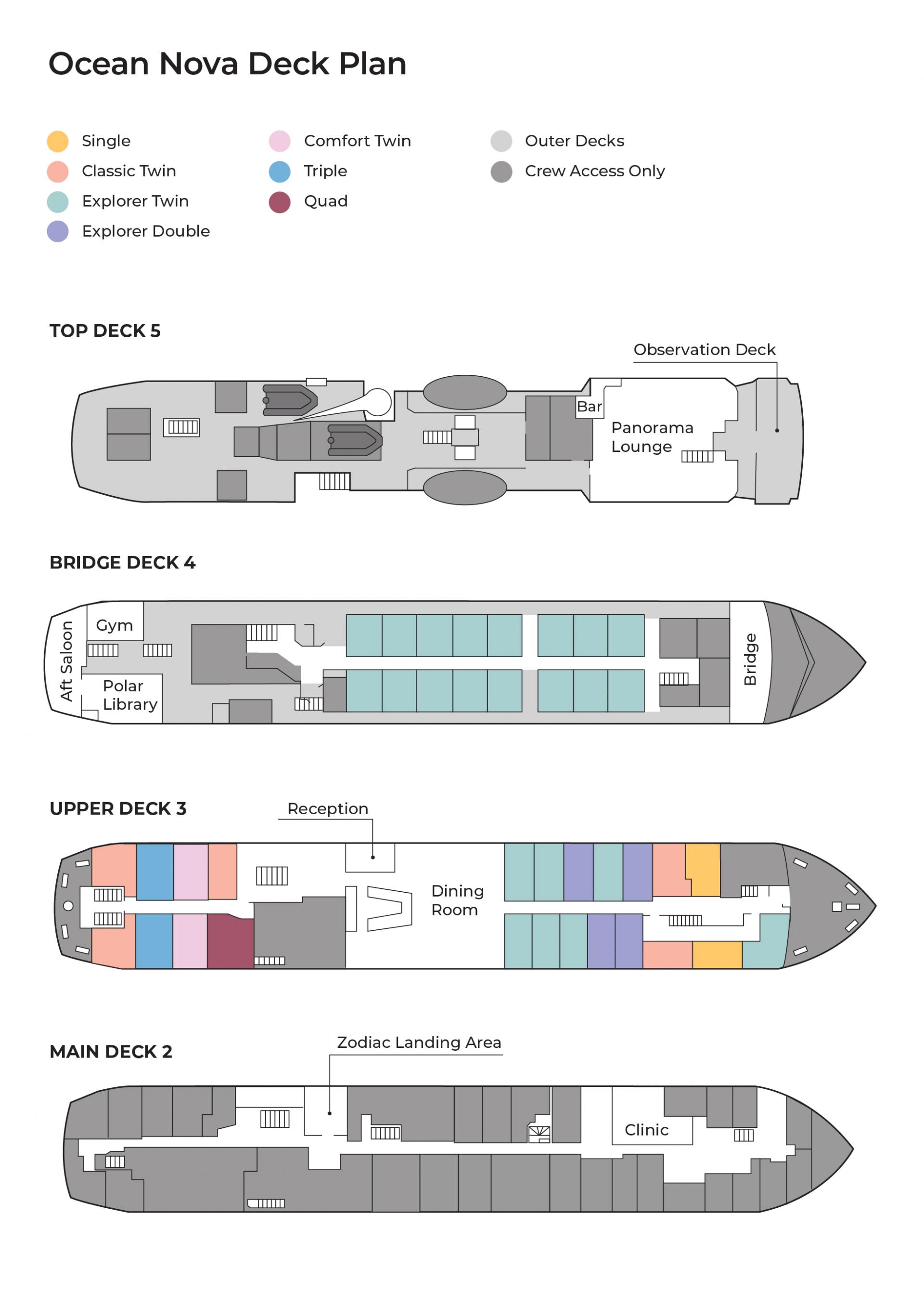 The Ocean Nova offers an intimate and classic Antarctic expedition experience. Its nimble and sturdy design, accommodating just 80 guests, allows access to remote bays and coves unreachable by larger vessels. Its compact size allows all passengers to disembark simultaneously in the Zodiacs, maximizing onshore exploration time. Sustainability and Design: Thanks to its efficient design, low fuel consumption (averaging 3.5 to 4 metric tonnes per day), and reinforced hull with a Superior Ice-Class rating, the Ocean Nova boasts one of the lowest emission levels in the Antarctic cruising industry. Onboard Experience: The atmosphere is friendly and relaxed, facilitated by its intimate size. The ship features the Panorama Lounge, considered the "heart of the Ocean Nova," which offers 200-degree vistas and extends to the outer decks for unparalleled wildlife viewing. Other amenities include a cozy Library and a lively Bar. Education and Service: With an industry-leading ratio of ten expert Expedition Guides for 80 guests, the ship ensures top-notch service and ample opportunities to engage in daily lectures on wildlife and geology. The integrated Citizen Science Program is seamlessly included to enrich the understanding of the polar environment.